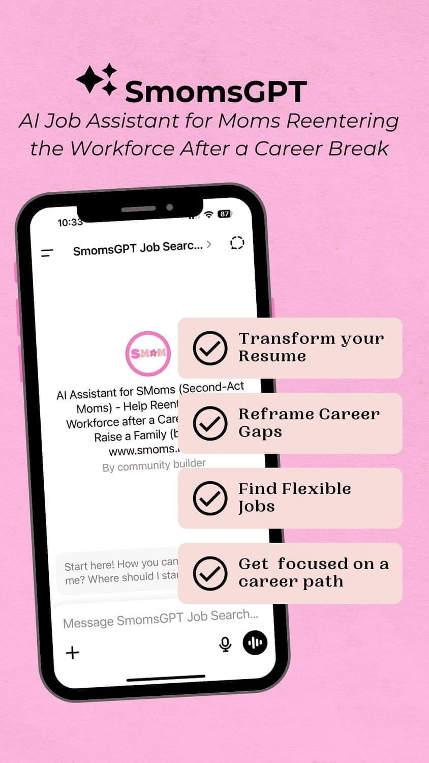 Be among the first moms to get free access to SmomsGPT, and get started with your career comeback today!